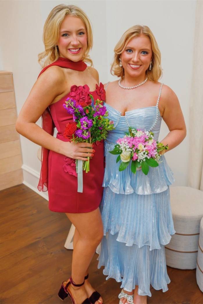 Beaded Neck Blue Tiered Metallic Long Dress