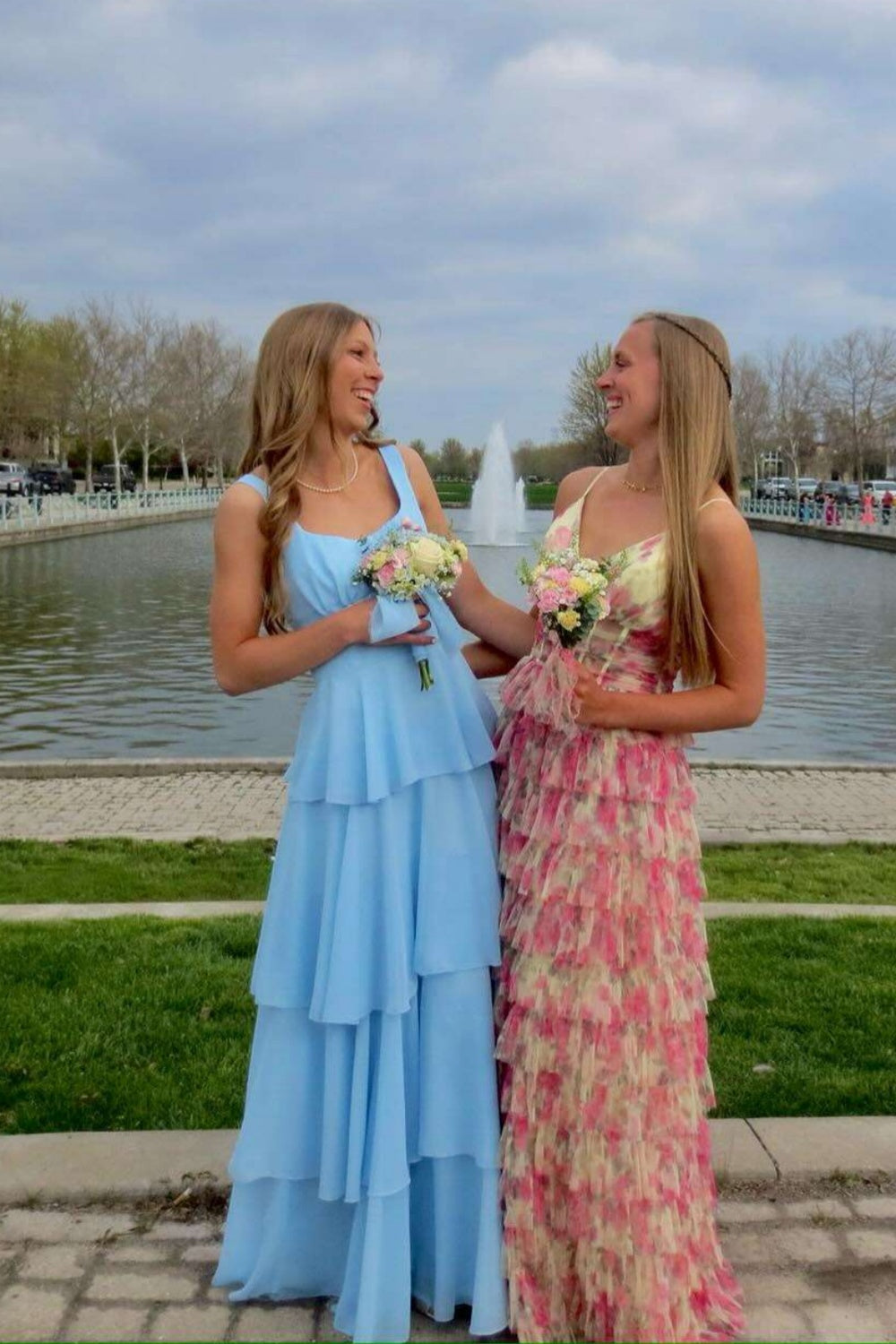 Square Neck Blue Tiered A-line Long Dress