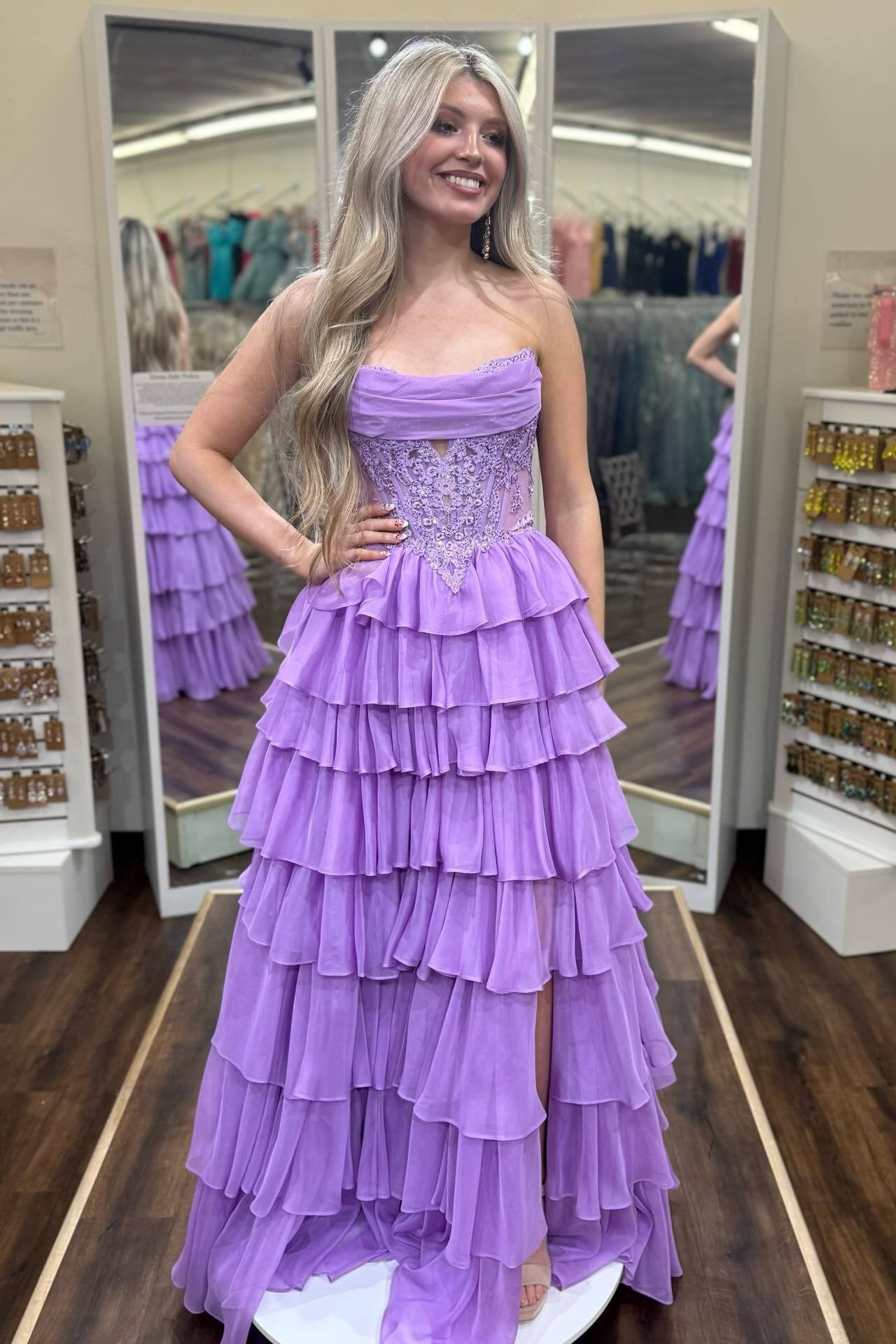 Strapless Blue Appliques Tiered Long Dress with Slit