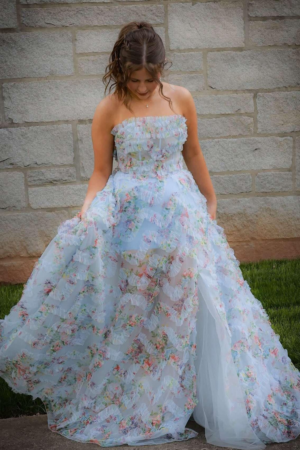 Strapless Blue Floral Print Ruffle Long Dress with Slit