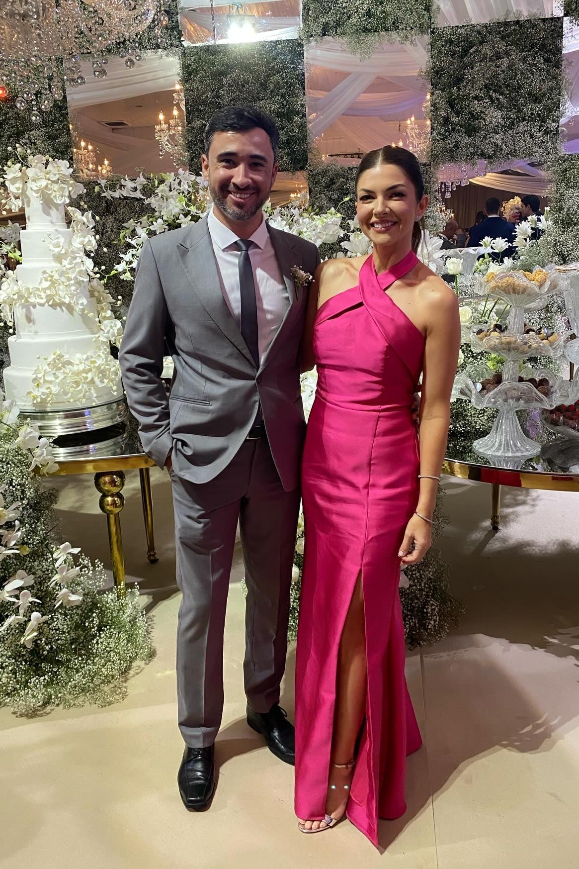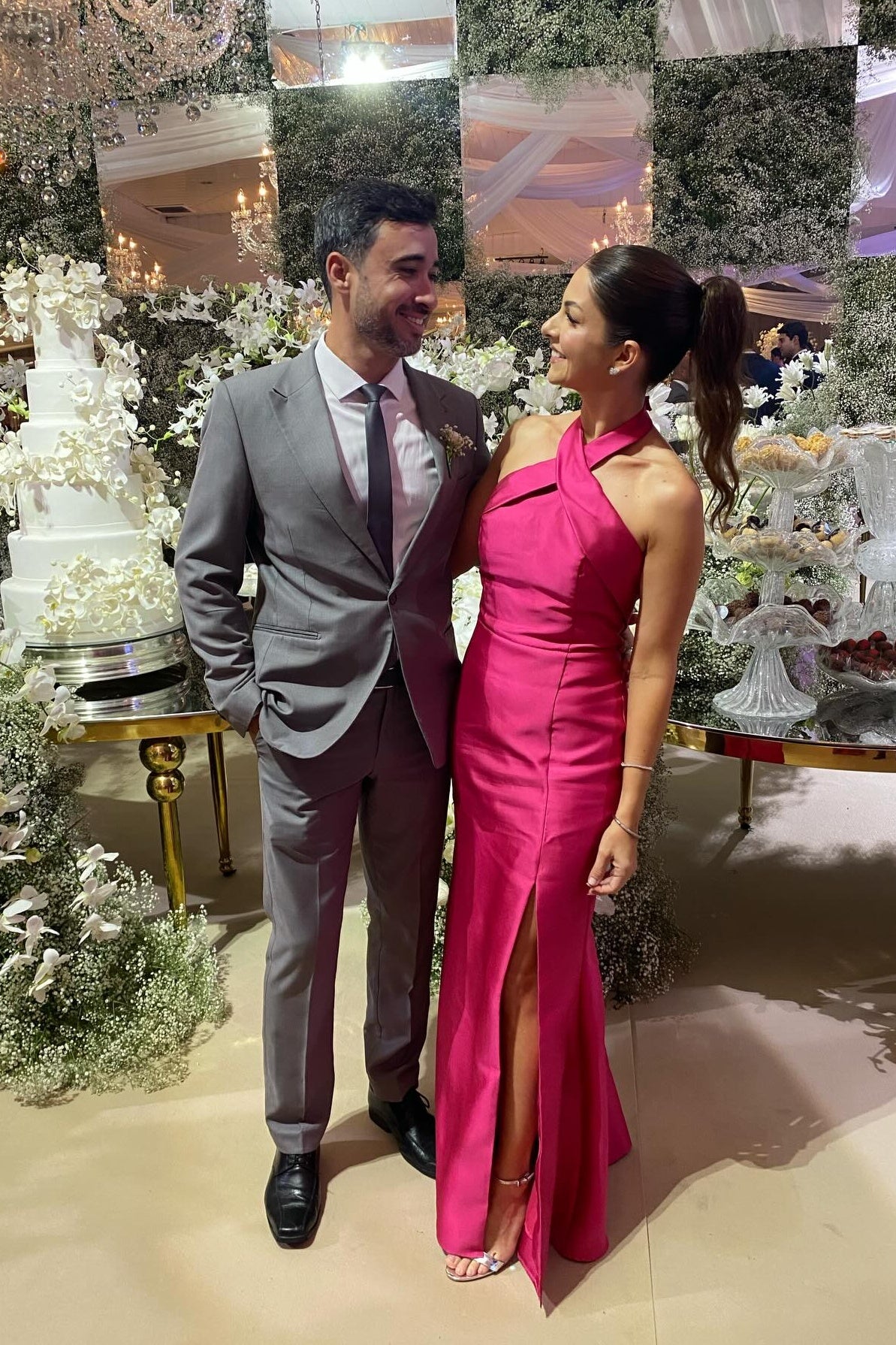 Hot pink satin bridesmaid dress featuring a flattering mermaid silhouette, halter neckline, and open back design. The side slit and full length create an elegant, sophisticated look perfect for wedding parties.
