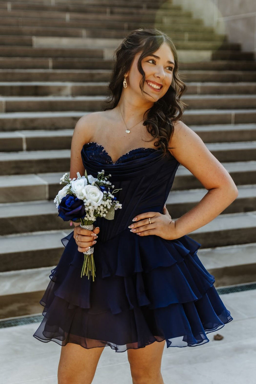 Strapless Yellow Appliques Neck Tiered Short Dress