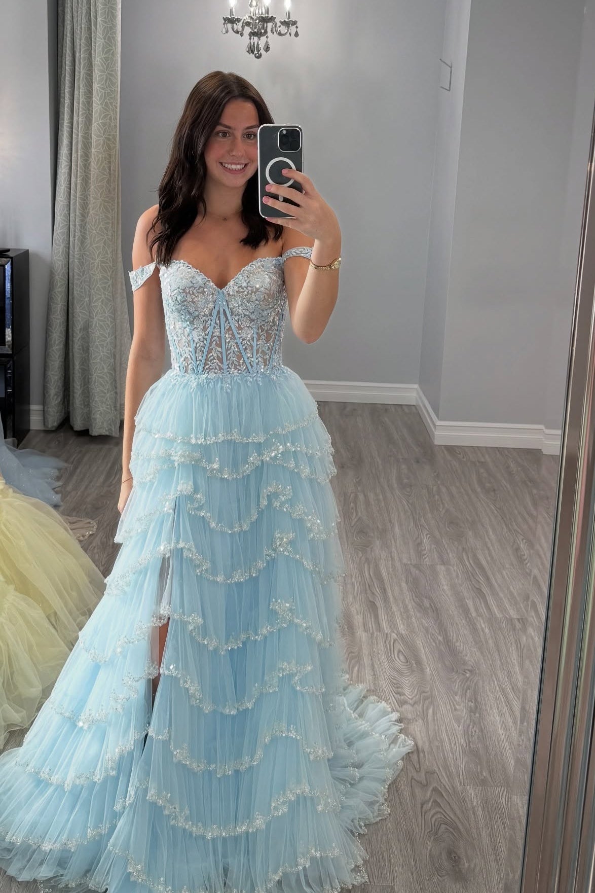 Off the Shoulder Light Pink Sequin Tiered Long Dress