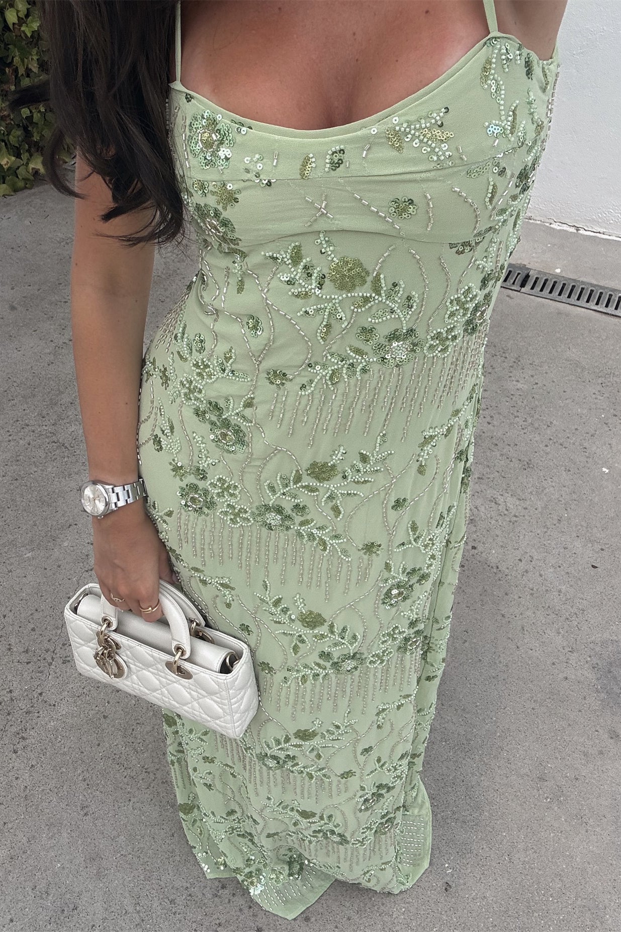 Spaghetti Straps Green Floral Beaded Long Dress