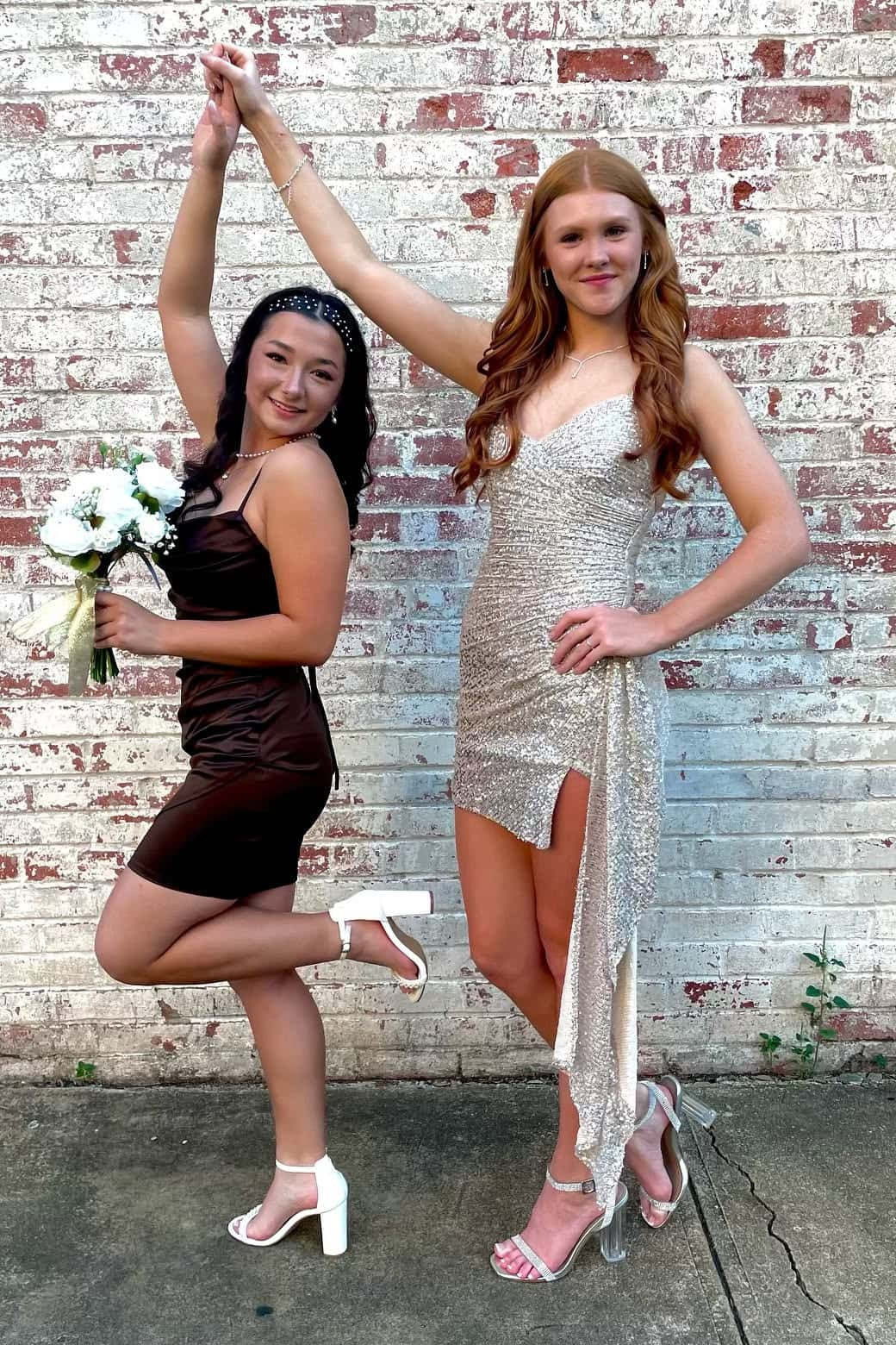 A glamorous gold sequin dress with a fitted silhouette and ruched bodice. Features spaghetti straps, a lace-up back, and a tasteful slit. Above-knee length for an elegant, eye-catching look.