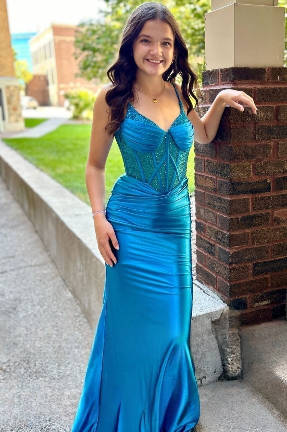 V-neck Red Beaded Mermaid Long Dress with Slit