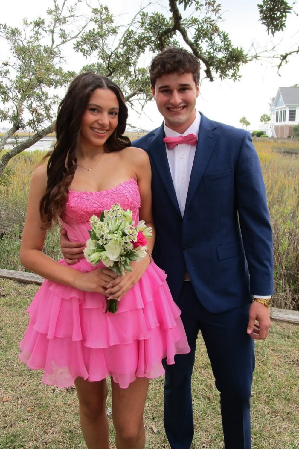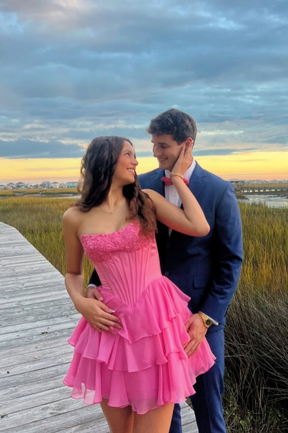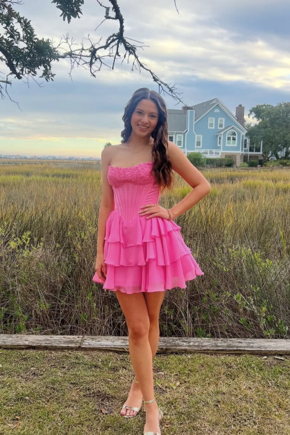 Square Neck Bright Pink Appliques Tiered Short Dress