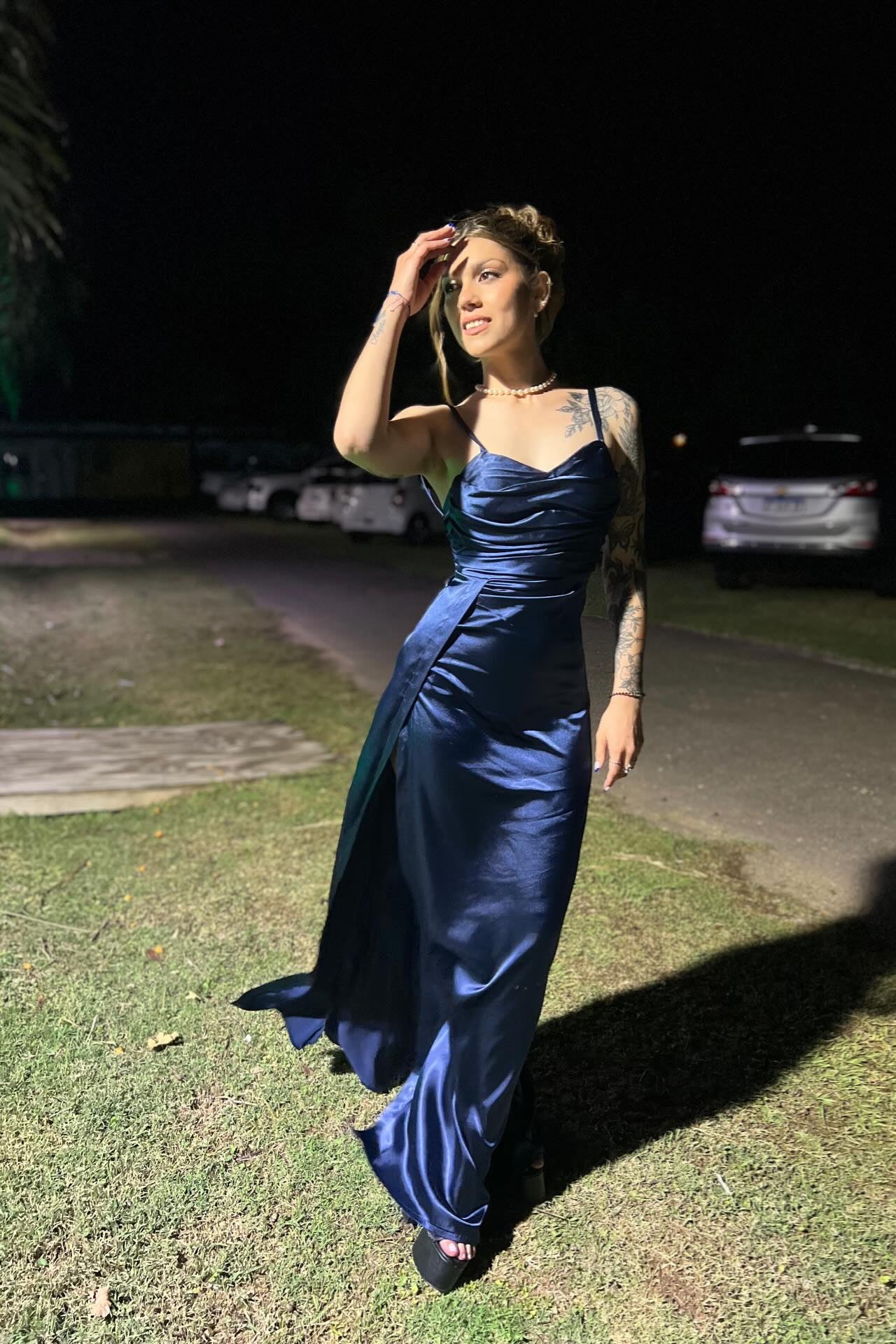 Straps Navy Blue Pleated Long Dress with Slit