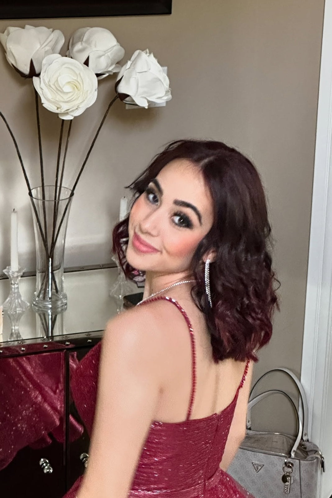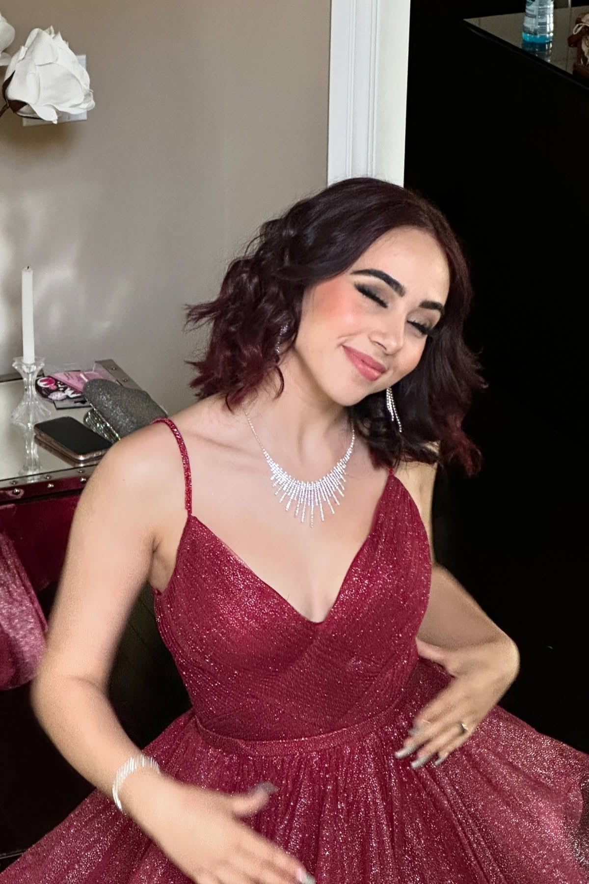 V-neck Burgundy Ruffles Glitter A-line Long Dress