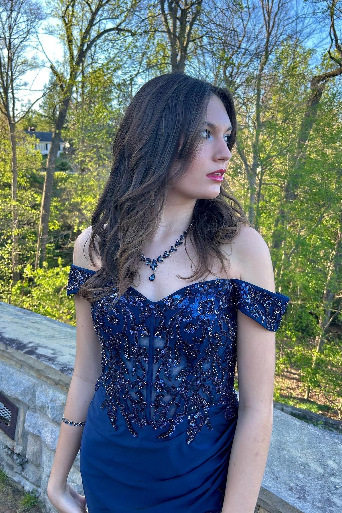 Navy blue satin sheath dress with an off-shoulder sheer bodice adorned with sequin appliques. Features a high side slit, zip-up back closure, and full length for an elegant, glamorous silhouette perfect for formal events.