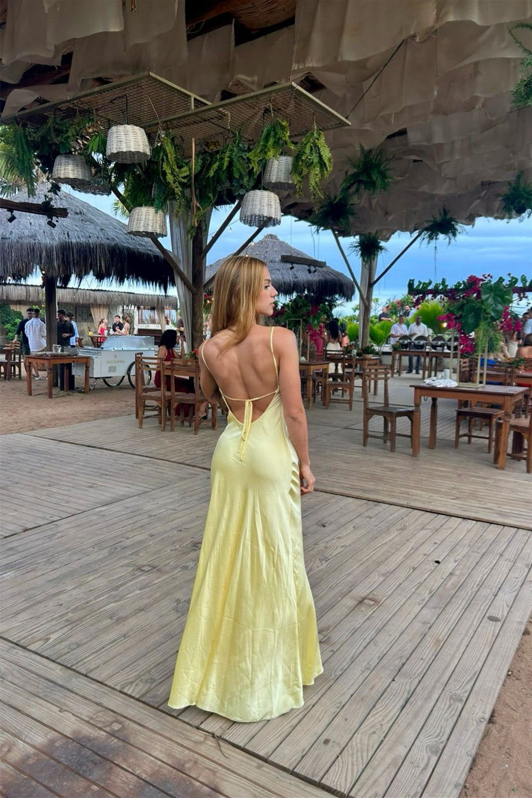 Yellow satin A-line dress with delicate spaghetti straps and backless design secured by a tie closure. Smooth, flowing fabric creates an effortlessly elegant silhouette. Full-length cut for timeless appeal.