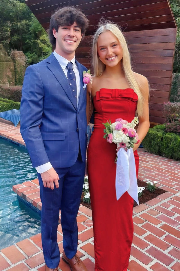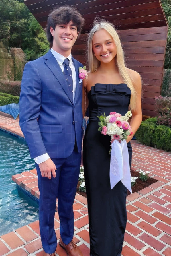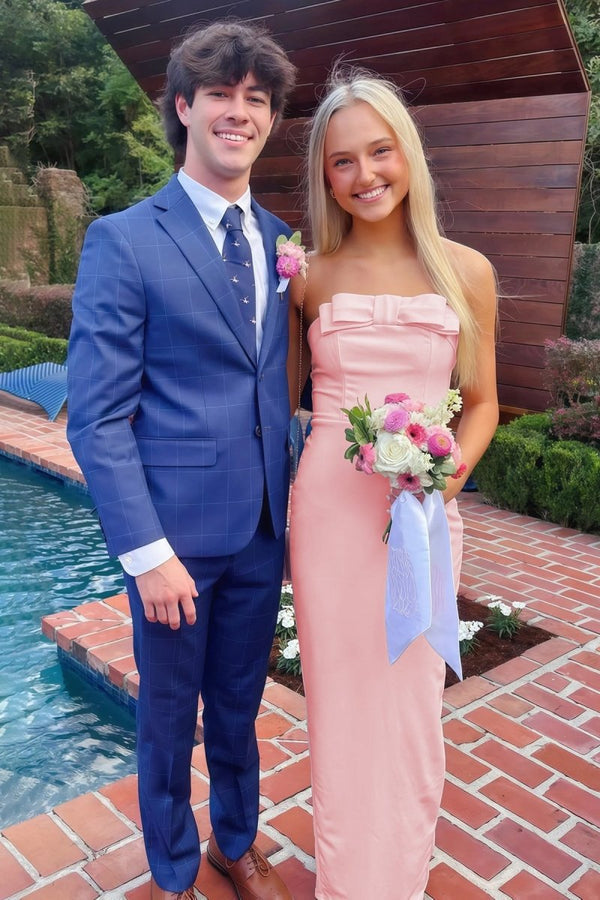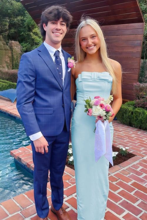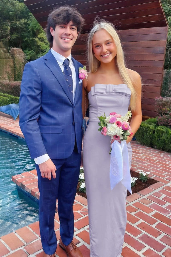 This sophisticated floor-length dress showcases a streamlined column cut in luxurious ivory satin. The strapless neckline pairs beautifully with an ornamental bow accent at the front, while a discreet zip closure at the back ensures a polished finish.