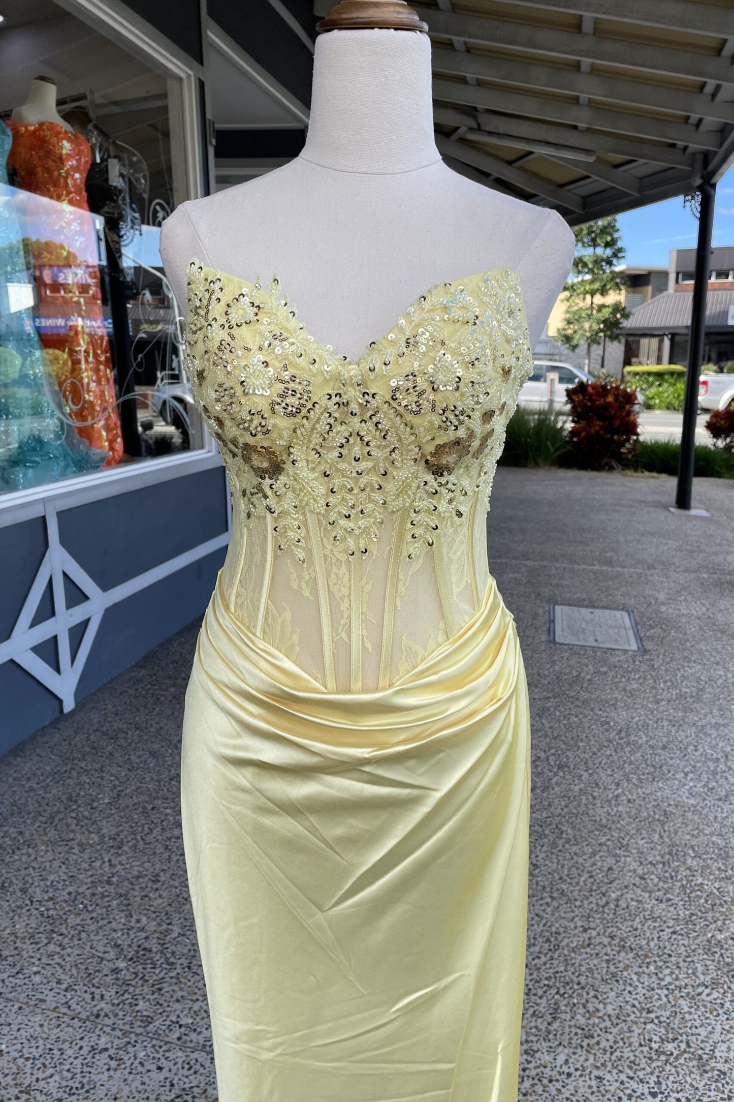 Radiant yellow satin mermaid dress with a strapless design and embellished bodice. Pleated construction and delicate lace detailing create an elegant, curve-hugging silhouette perfect for formal occasions.