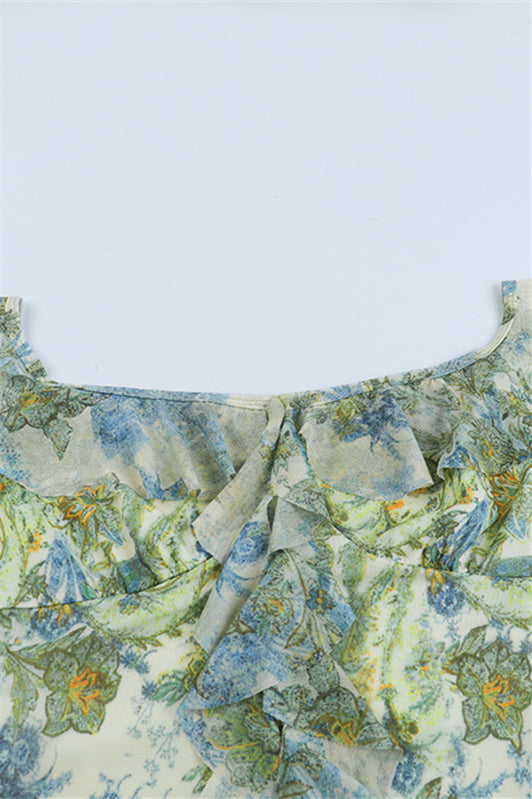 Ruffle Straps Green Floral Print A-line Maxi Dress