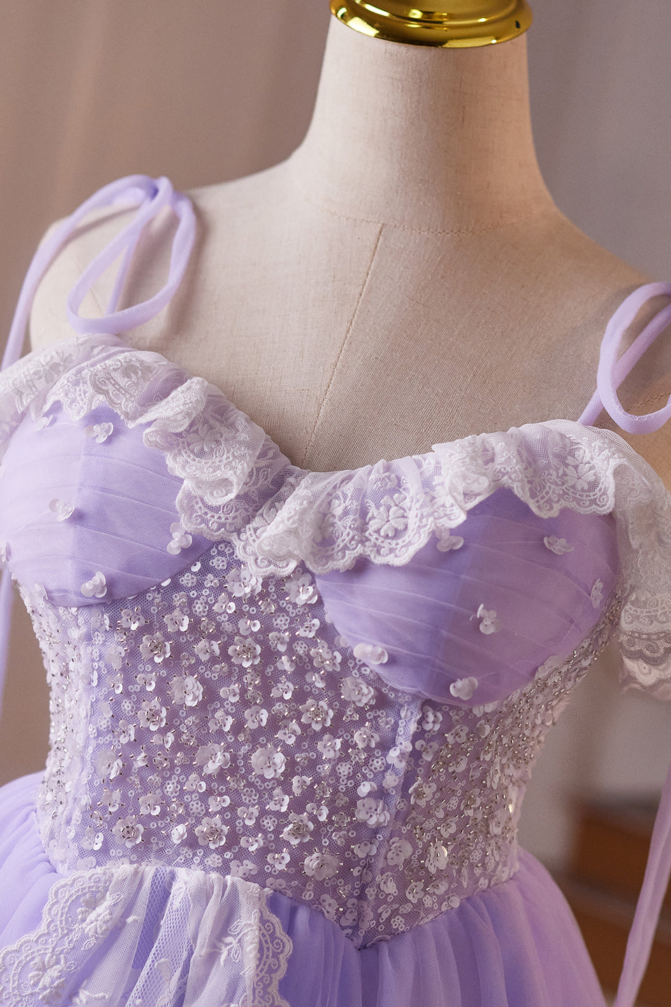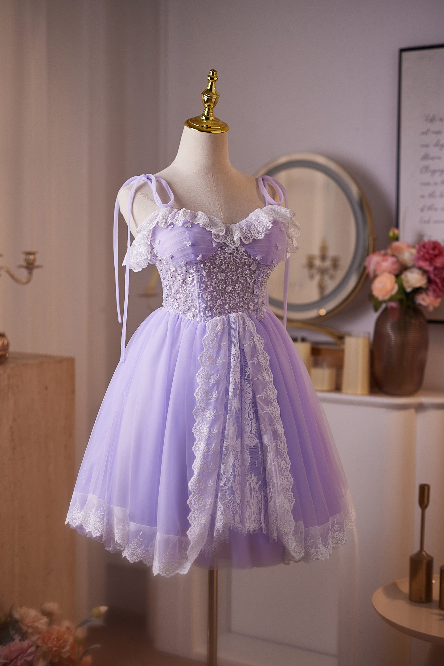 Tie Shoulder Lilac Lace Stitching Beaded Short Dress