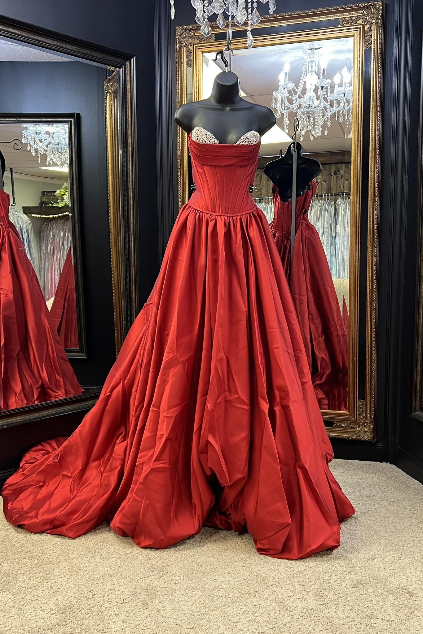 Sophisticated red A-line gown in luxurious satin with a beaded neckline and fitted corset bodice. Ruched detailing adds dimension to the silhouette, while the zip-up back ensures a polished finish. An ideal choice for formal occasions.