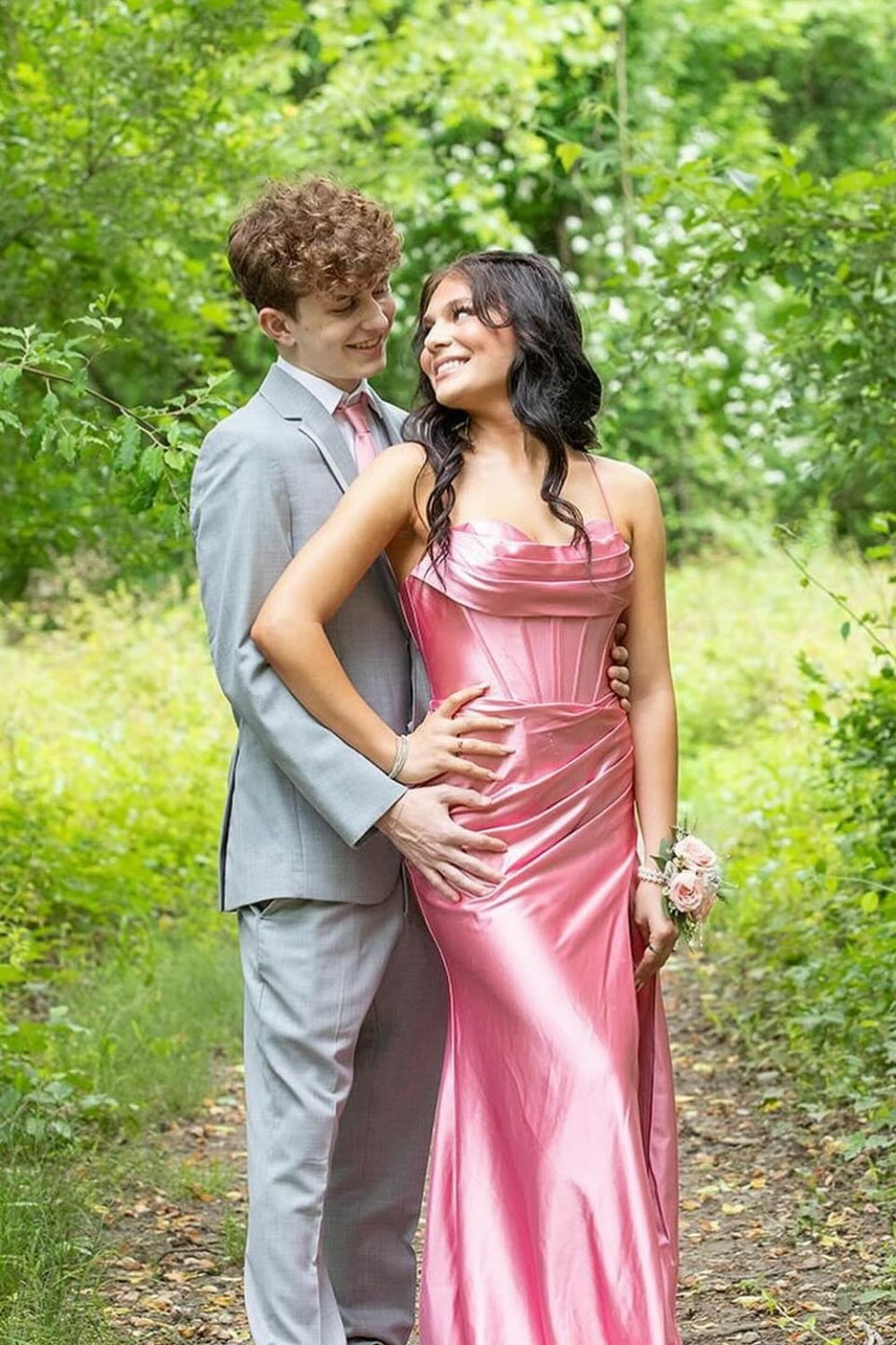 Elegant rose satin mermaid gown featuring a sweetheart neckline, ruched corset bodice, and lace-up back. Spaghetti straps and a thigh-high slit add sophistication to this full-length evening dress, perfect for formal occasions.