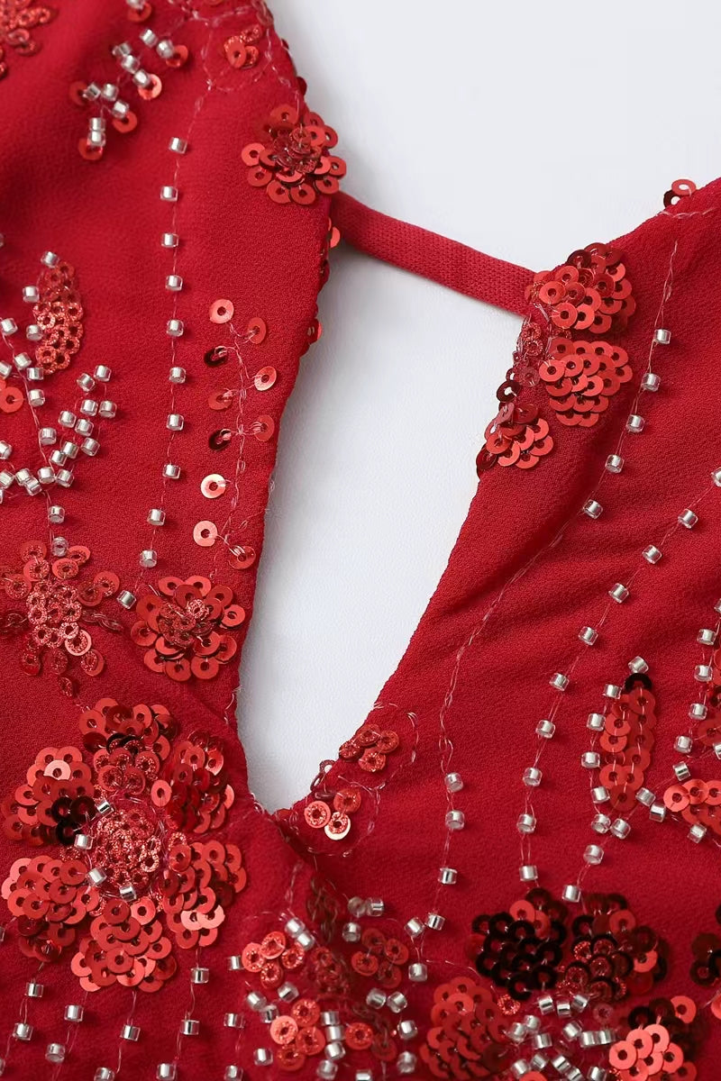 Halter Burgundy Floral Beaded Long Dress with Keyhole