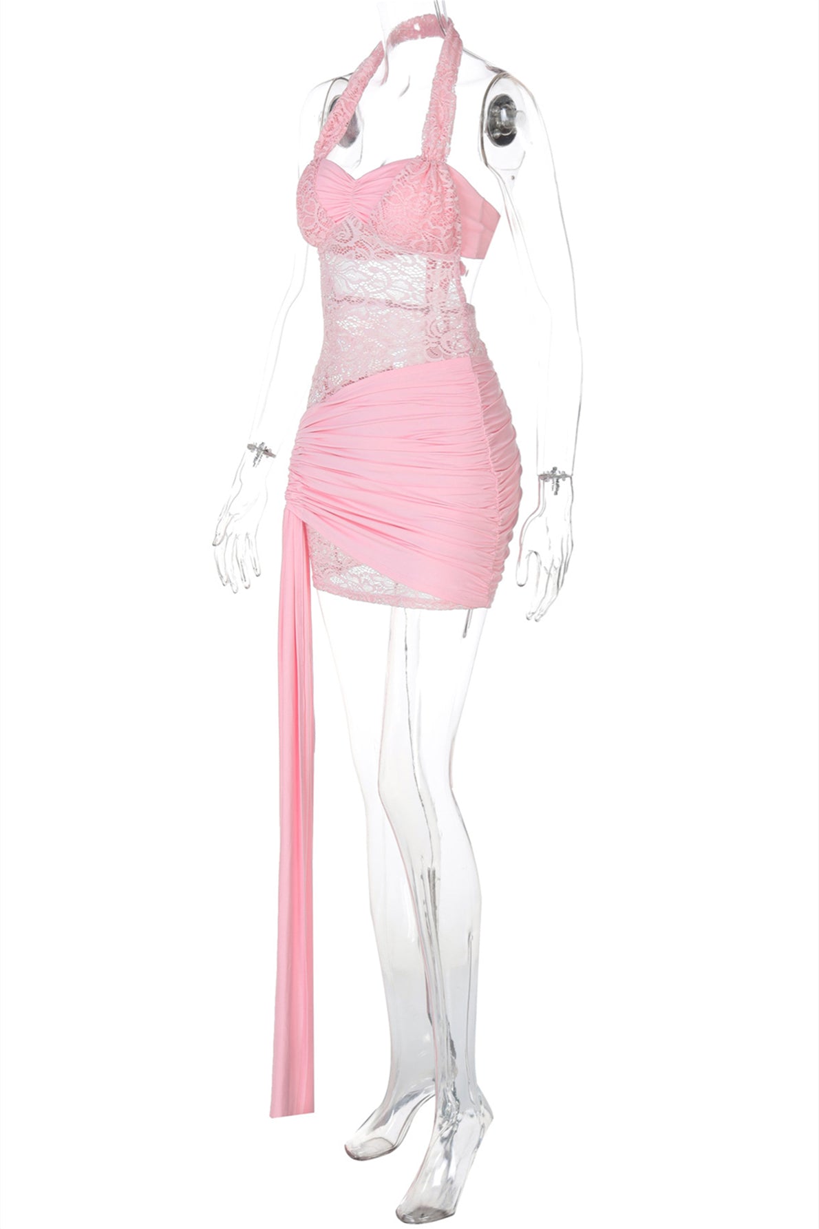 Halter Pink Lace Sheer Corset Bodycon Short Dress