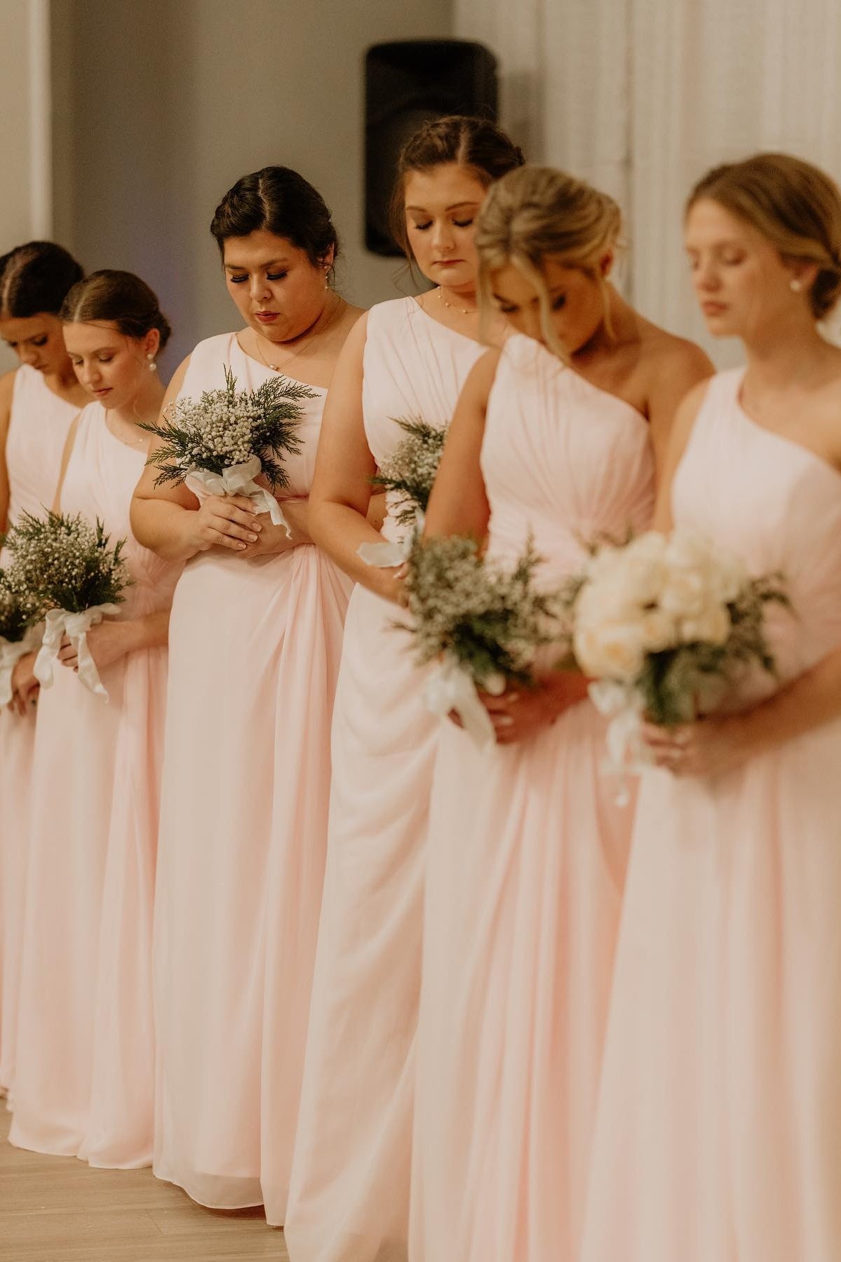 Sophisticated light pink chiffon dress designed for bridesmaids who value understated elegance. The single-shoulder cut pairs beautifully with a waist twist detail and supportive corset bodice, while the flowing A-line skirt creates graceful movement.