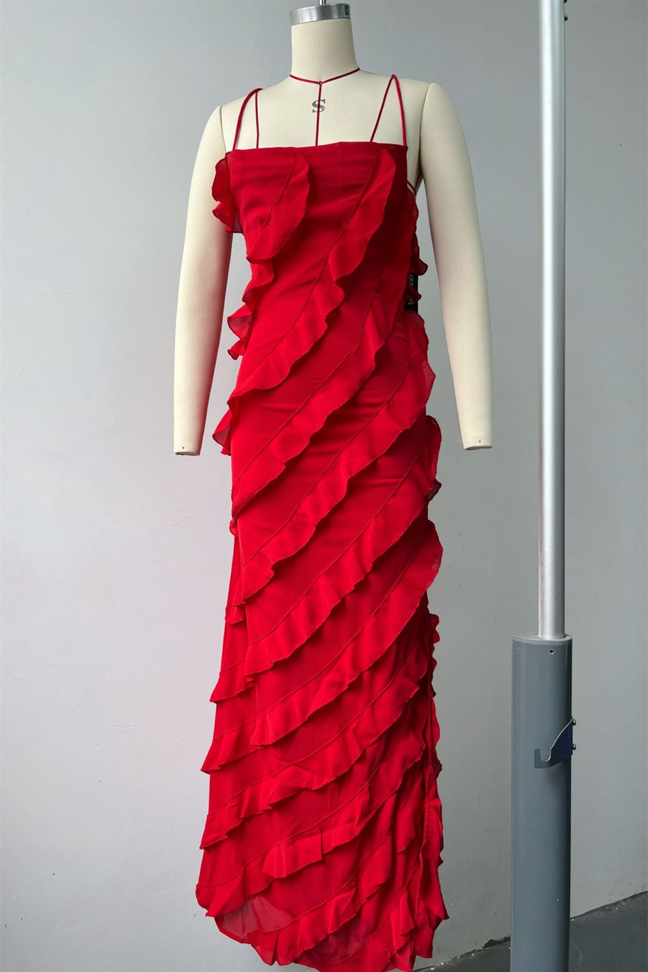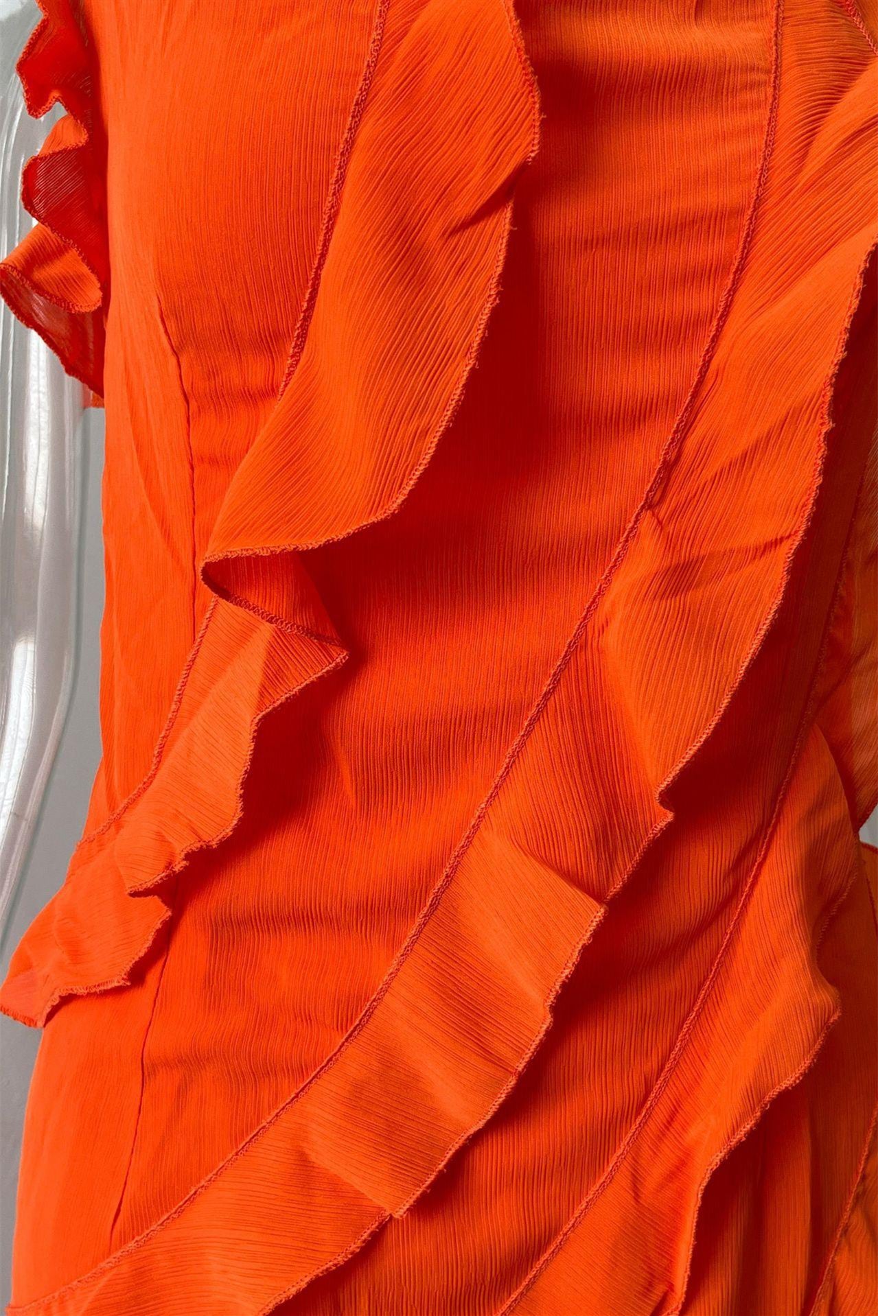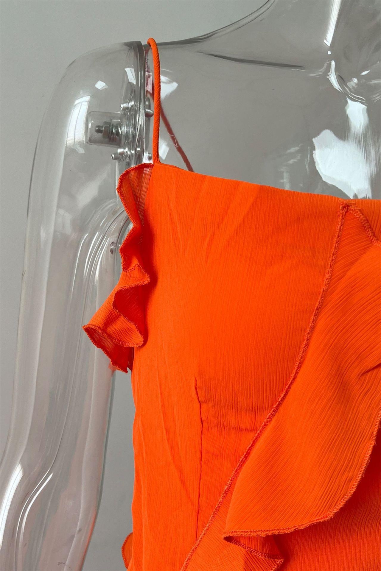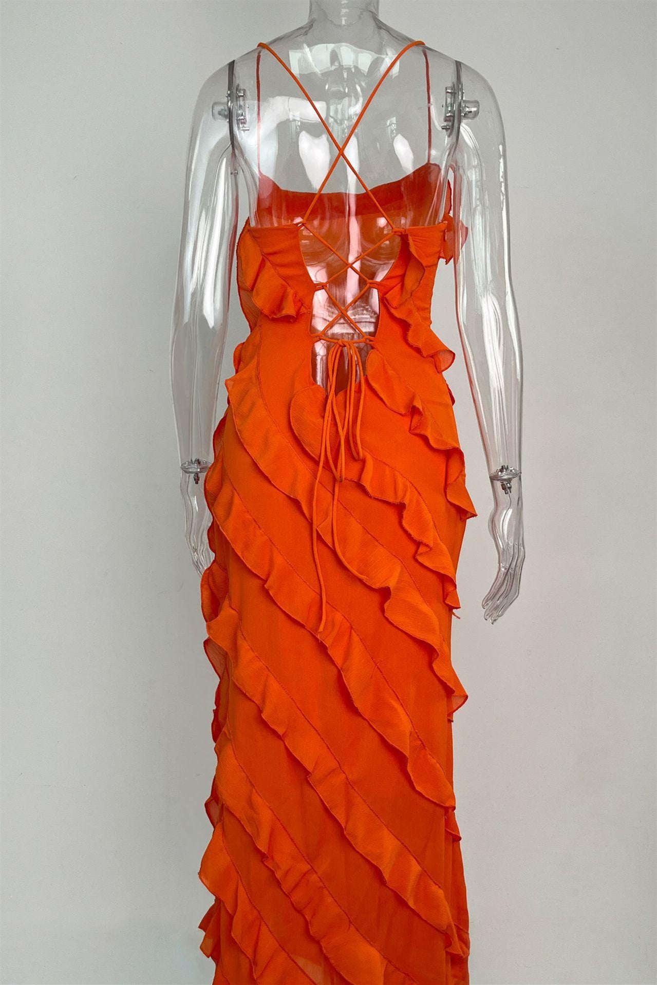 Spaghetti Straps Orange Ruffled Long Dress with Slit
