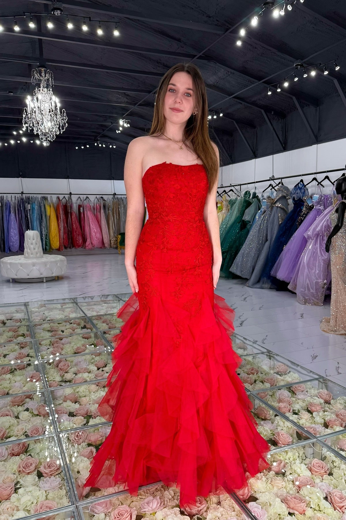 Strapless Yellow Appliques Ruffles Hem Long Dress