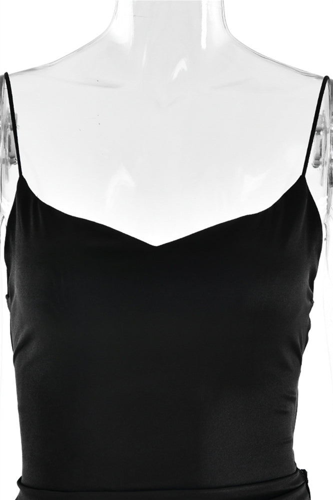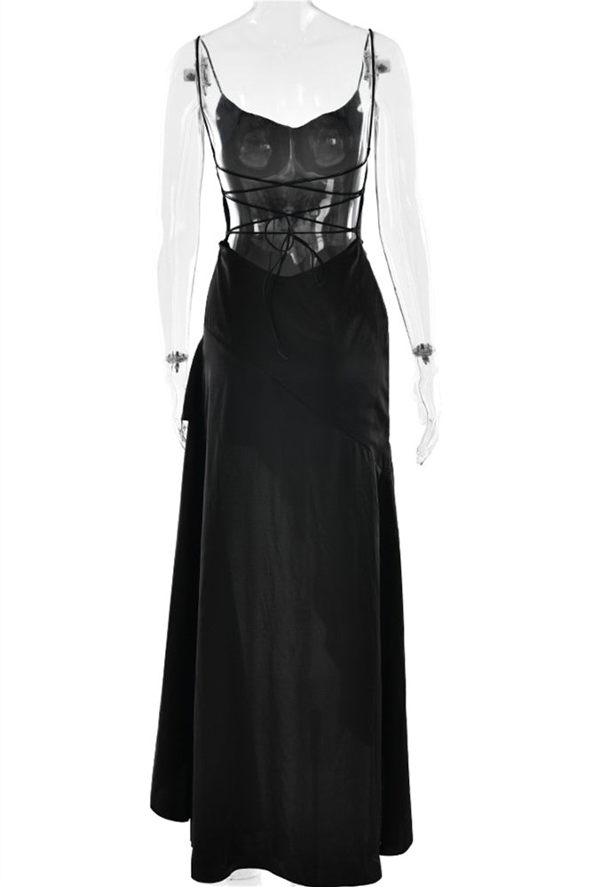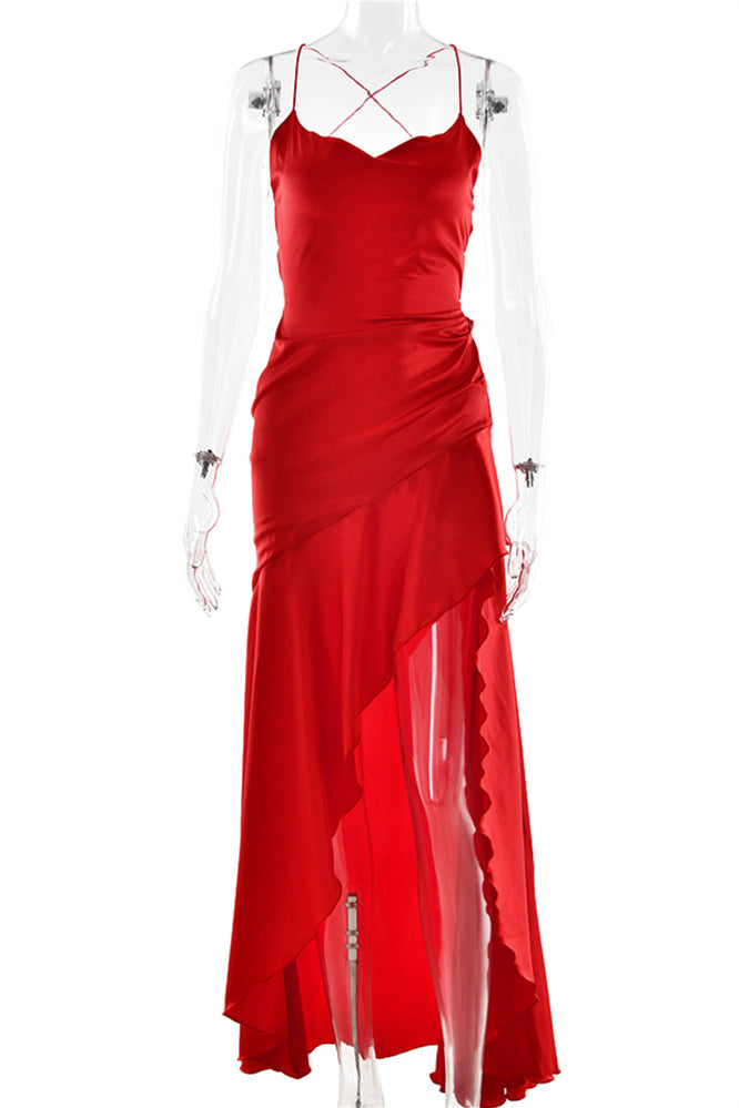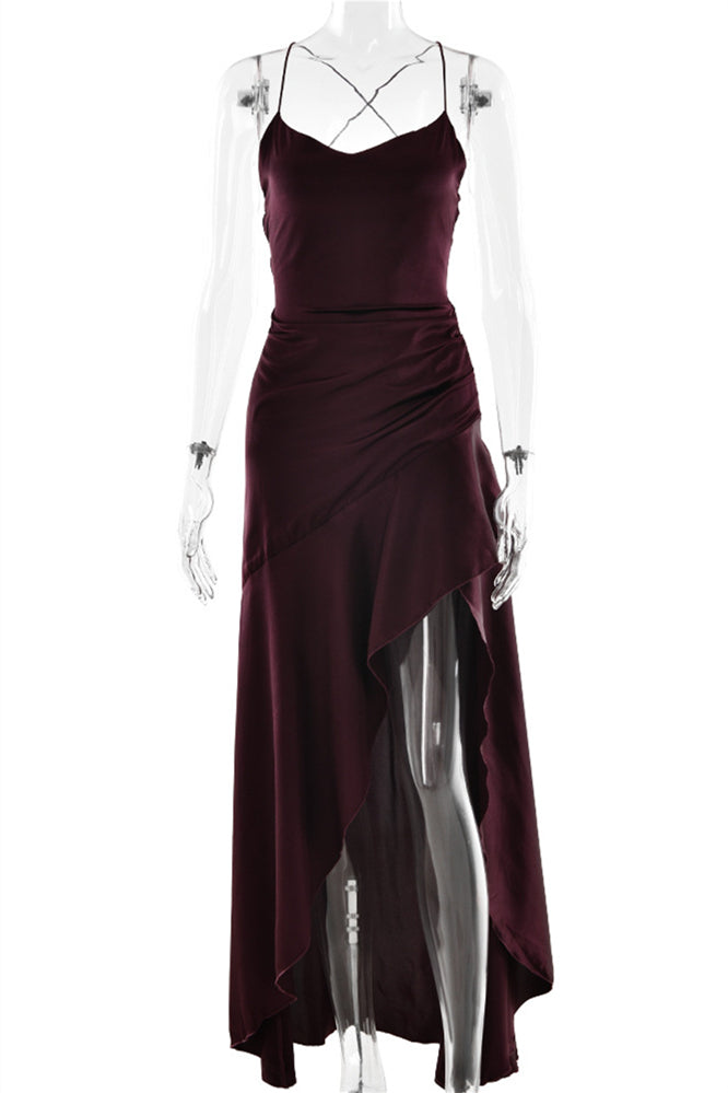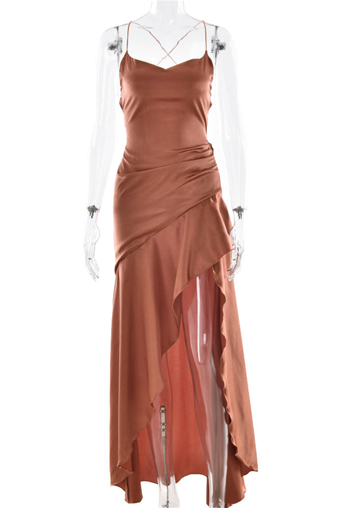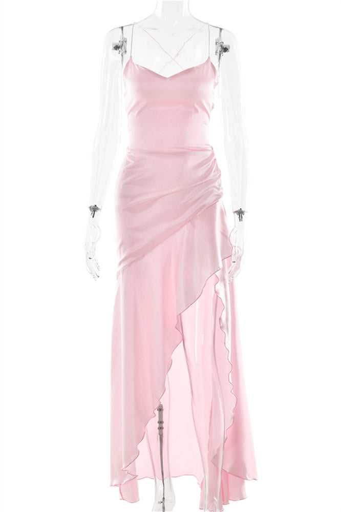 Straps Navy Blue Ruffled Hem Long Dress with Slit