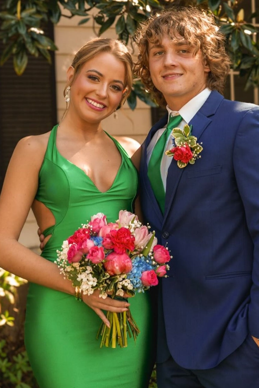 V-neck Blue Open Back Ruched Mermaid Long Dress